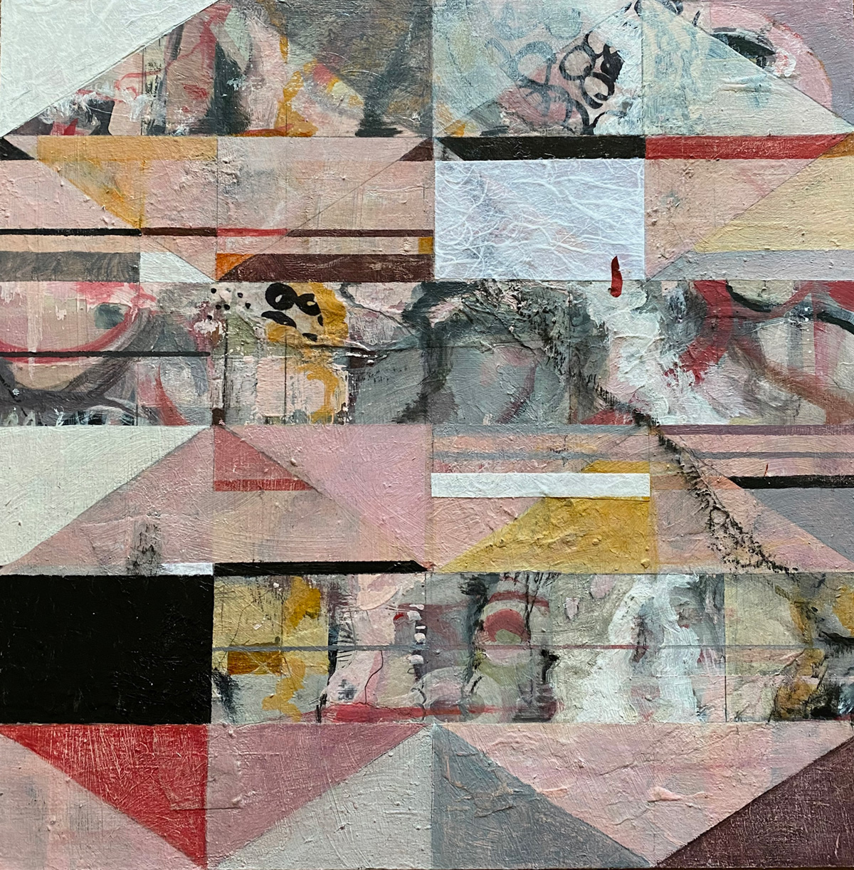 “Hidden Assets”, Acrylic, Collaged Found and Handpainted Papers, and Graphite on Wood Panel; Framed, 12”x12”, 2021