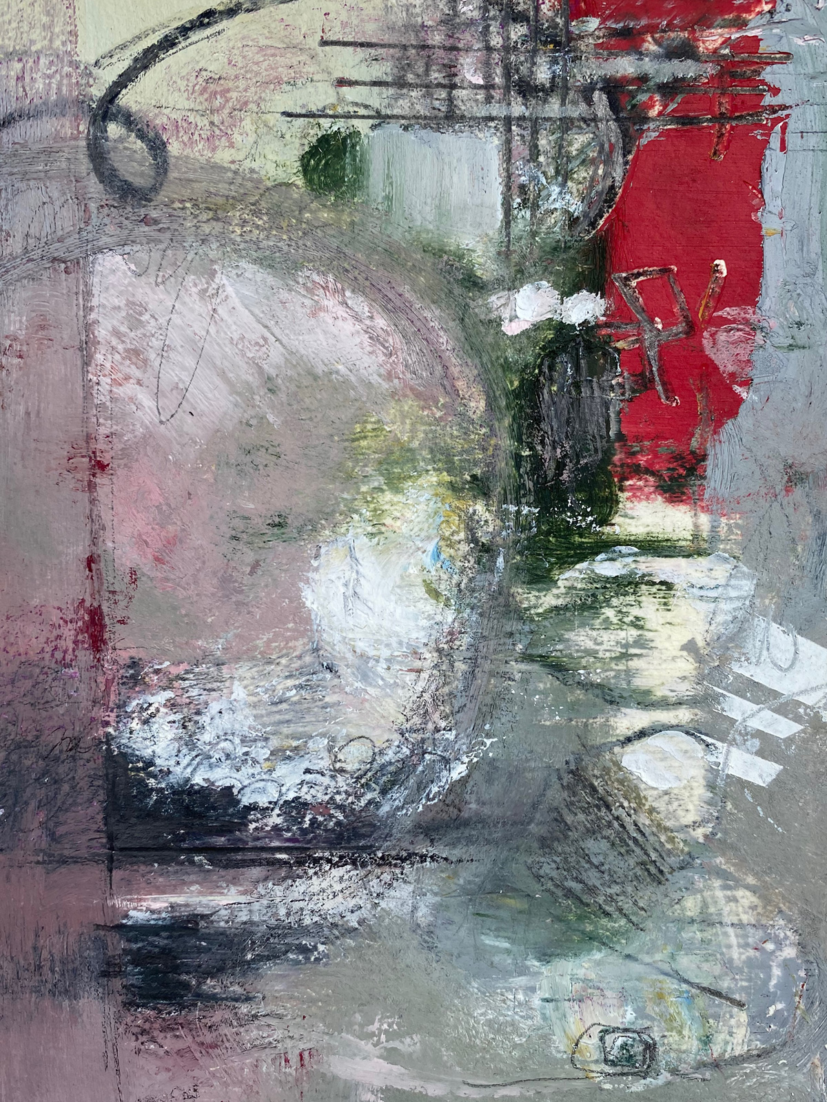 “Red #2”, Oil & Cold Wax, Charcoal, Graphite on Arches Paper, 7”x5” unframed, 2020